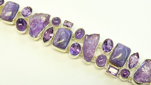 Drie soorten amethist (facetgeslepen, cabochongeslepen en ruw) gecombineerd met charoiet. Eigenlijk zegt dit al wel genoeg, dus: klaar!