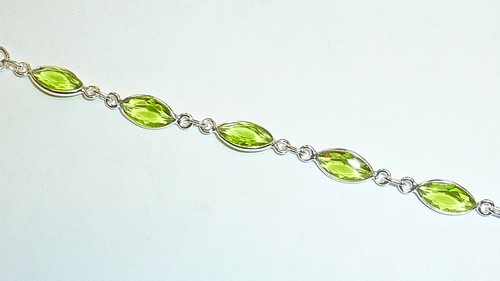 Negen markiesgeslepen stukje peridot, gevangen in zilver. Hij ziet er een beetje fragiel uit en als ik eerlijk ben: dat is hij ook. Dus nooit samen met een andere armband dragen. Deze moet solo en dat verdient hij ook.