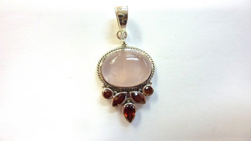 Een cabochongeslepen roze kwarts met daaronder vijf gefacetteerde granaatjes: wat een prachtige cobi. Eigenlijk te mooi om waar te zijn, maar hij bestaat echt!